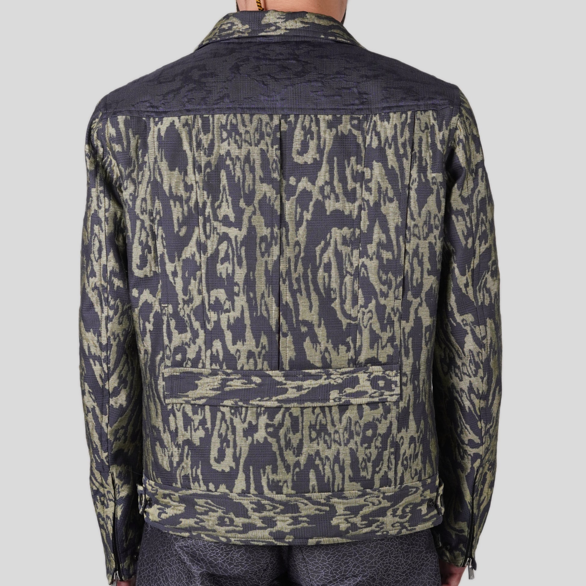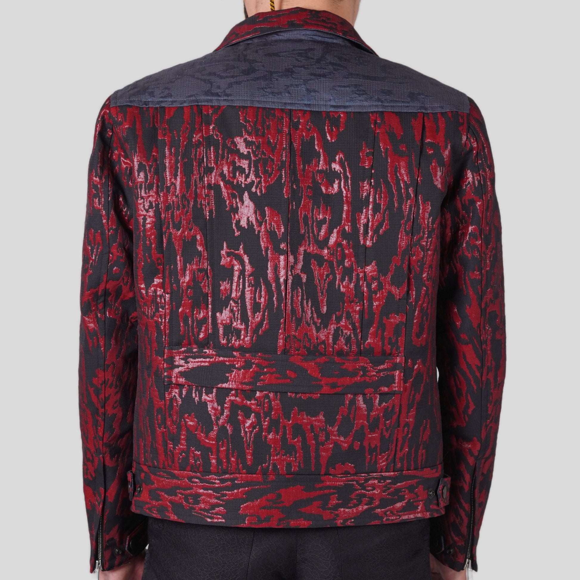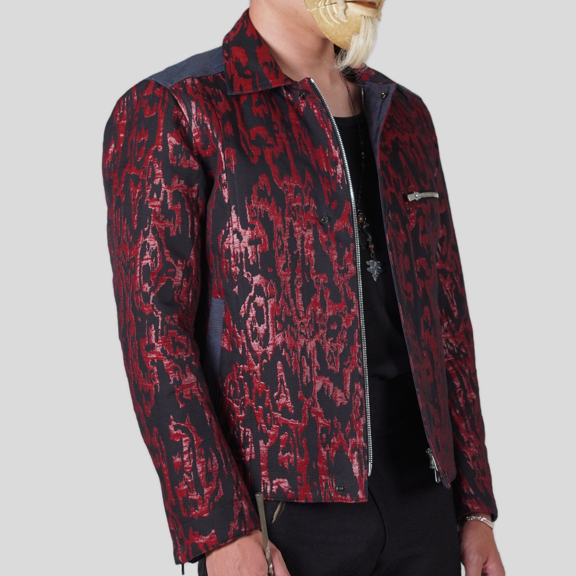 日本の工芸品は用の美を追求した伝統的なものづくりになります。しかし、現代の生活様式が変化する以上は不自由な要素が生まれるのも伝統工芸の特徴です。それでも美しいと思える伝統工芸の美に注目をしてジャケットのデザインを製作しました。帯地の幅であることで余分にできる生地の切り返しなど「伝統工芸の美とは何か」の疑問から生まれたジャケットになります。