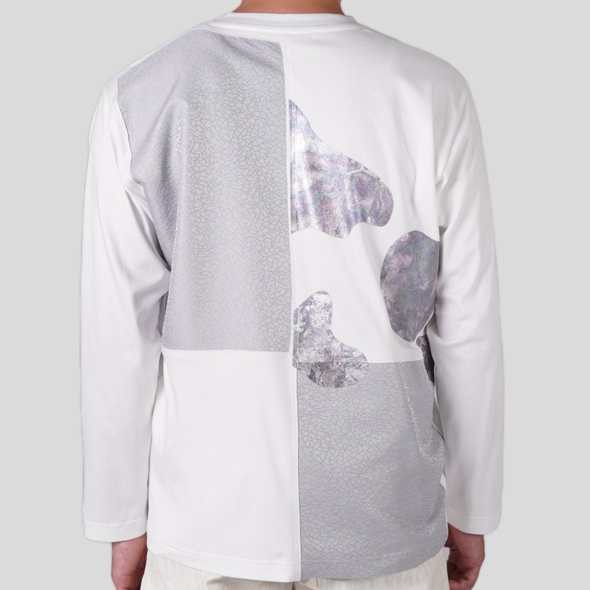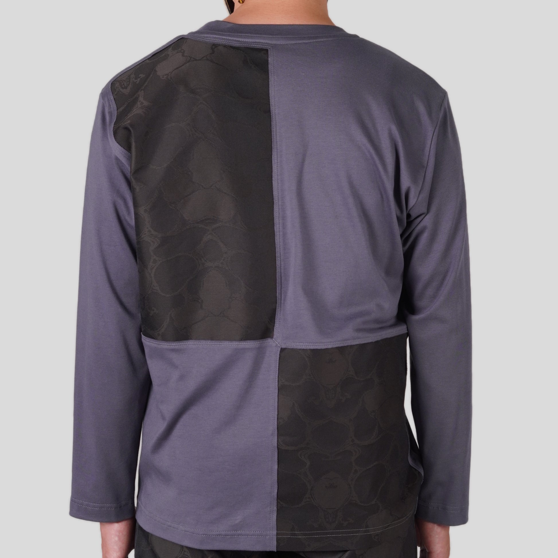 日本の伝統的な文様「市松文様」。市松は、格子模様の一種で、色違いの正方形や長方形を交互に並べた模様のことです。伝統的文様の特徴としたカジュアルに着こなせるT-shirtは西陣織のエレガントな織物とパッチワークのデザインを融合することで侘び寂びを表現しています。