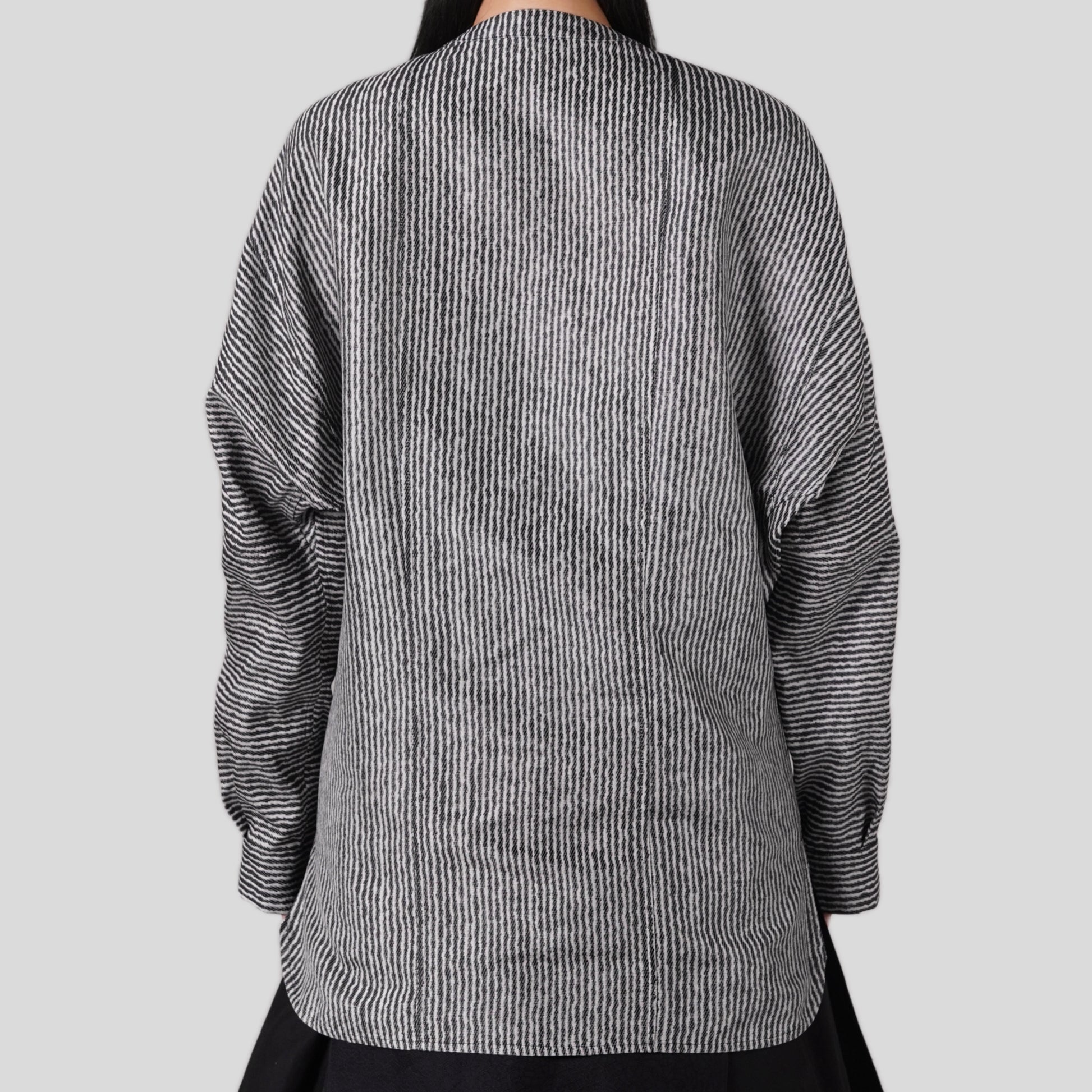 動きやすさを重視してゆとりのあるシャツになります。ドルマン方の袖の形状は帯地を使用しているからできるデザインとなっておりモダンな切り返しを特徴としています。